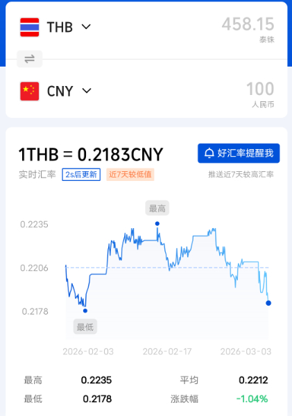 今日人民币泰铢汇率2026/3/3