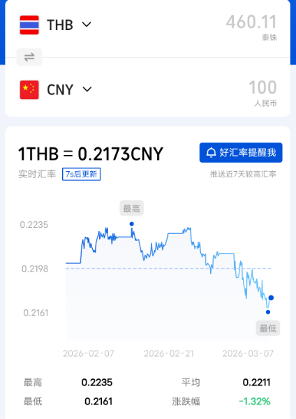 今日人民币泰铢汇率2026/3/7