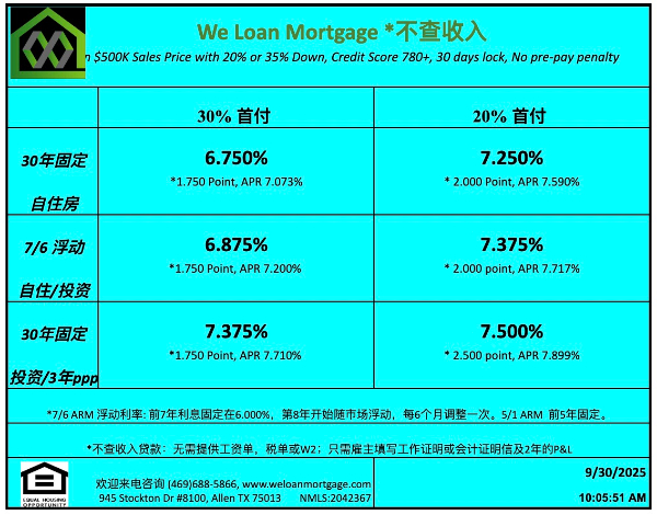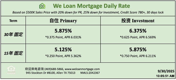 威隆贷款 WLM 今日房屋贷款利率 09/29/2025