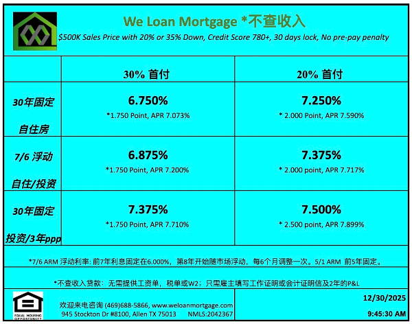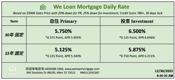 威隆贷款 WLM 今日房屋贷款利率 12/30/2025