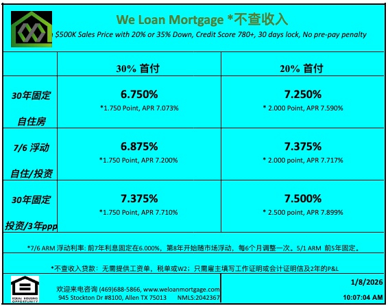 威隆贷款 WLM 今日房屋贷款利率 01/08/2026