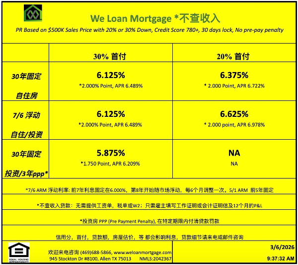 威隆贷款 WLM 今日房屋贷款利率 03/06/2026