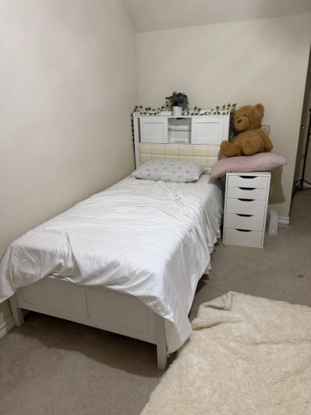 在二楼。需共用卫浴,家具,洗衣机烘干机俱全。有一个小储藏室,还有衣帽间。